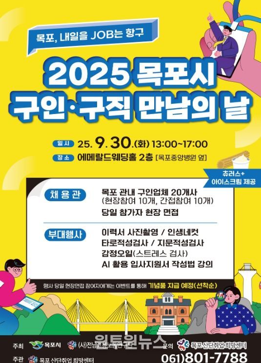 (원투원뉴스) 목포시는 오는 9월 30일(화) 오후 1시, 에메랄드웨딩홀 2층에서 ‘2025 목포시 구인·구직 만남의 날’ 행사를 개최한다고 밝혔다.
