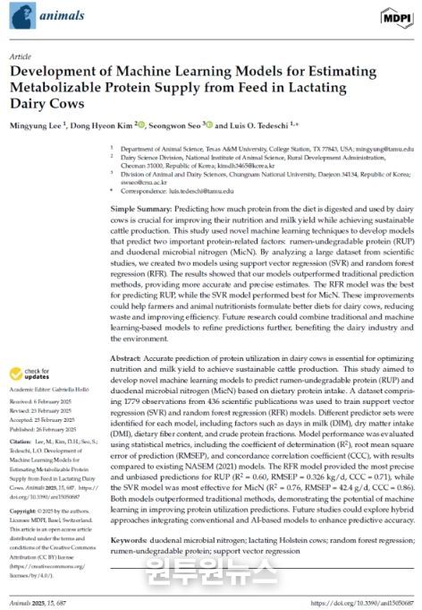 두 가지 예측 모형은 젖소에게 공급되는 핵심 단백질인 ‘반추위에서 분해되지 않고 소장에서 흡수되는 단백질(RUP)’과 ‘반추위 미생물이 사료를 분해하며 합성하는 단백질(MicN)’을 정확히 예측할 수 있도록 설계됐다.