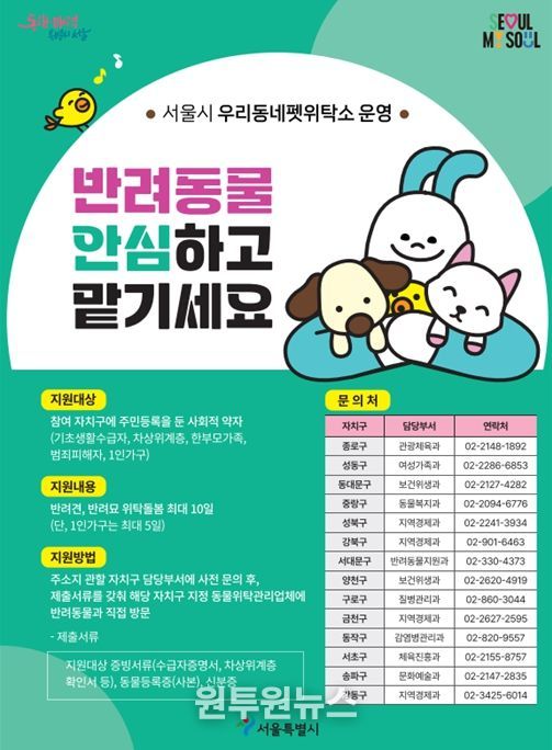 (원투원뉴스) 서울시는 추석 연휴를 맞아, 사회적 약자가 장기간 집을 비워야 할 때 반려동물을 안전하게 맡길 수 있는 ‘우리동네 펫위탁소’를 올해에도 14개 자치구 31개소에서 운영한다고 밝혔다. 기초생활수급자·차상위계층·한부모가족 등 취약계층은 최대 10일, 1인 가구는 최대 5일까지 무료 돌봄을 지원받을 수 있다.
