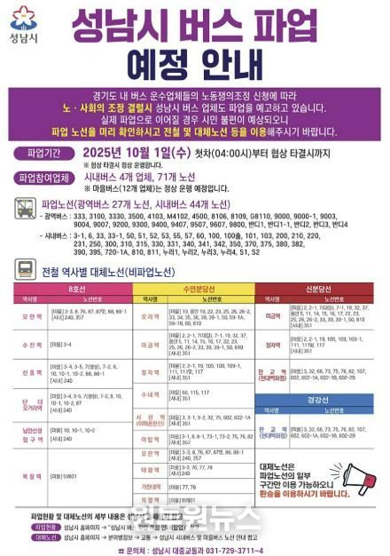 (원투원뉴스) 성남시는 경기도버스노동조합협의회가 임금 인상 등을 요구하며 10월 1일 총파업을 예고함에 따라 시민 불편을 최소화하기 위해 비상수송대책본부를 가동하고 비상수송 대책을 시행한다고 밝혔다.