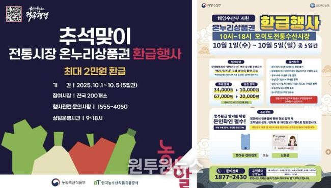 (원투원뉴스) 시흥시는 추석 명절을 앞두고 전통시장 소비 촉진과 장바구니 물가 부담 완화를 위해 오는 10월 1일부터 5일까지 5일간 오이도전통수산시장과 삼미시장에서 ‘온누리상품권 환급행사’를 추진한다.