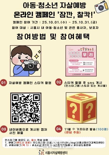 (원투원뉴스) 시흥시자살예방센터는 오는 10월 1일부터 31일까지 한 달간 아동ㆍ청소년을 대상으로 생명존중 인식 확산 캠페인을 운영한다. 이번 캠페인은 아동ㆍ청소년이 심리적 지지를 얻고 생명의 소중함을 되새기도록 돕는 한편, 이를 누리소통망(SNS)을 통해 또래와 나눌 수 있도록 마련됐다.