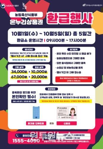 (원투원뉴스) 군산시가 추석을 앞두고 장바구니 물가 부담을 덜기 위해 농림축산식품부·해양수산부가 주관하는 ‘농축·수산물 온누리상품권 환급행사’를 오는 10월 1일부터 5일까지 진행한다.