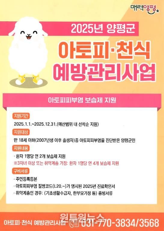 (원투원뉴스) 양평군은 지역사회 중심의 알레르기질환 조기 발견과 적절한 치료를 위해 2025년 연중 ‘아토피 피부염 보습제 지원’과 ‘취약계층 알레르기질환 의료비 지원’을 실시한다고 밝혔다.