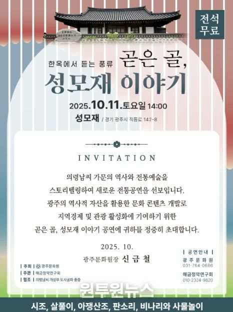 (원투원뉴스) 광주문화원은 성모재(직동로142-8)에서 2025년 10월 11일 14:00 시민들을 대상으로 “제10회 광주시 문화의 날 행사” 를 개최한다고 밝혔다.