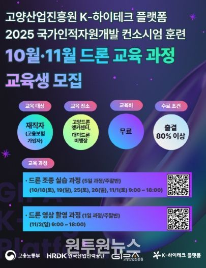 (원투원뉴스) 고양산업진흥원 K-하이테크플랫폼지원단이 고용노동부와 한국산업인력공단이 주관하는 국가인적자원개발 컨소시엄 사업의 일환으로, 드론·생성형 AI 교육과정 교육생을 모집한다고 밝혔다.