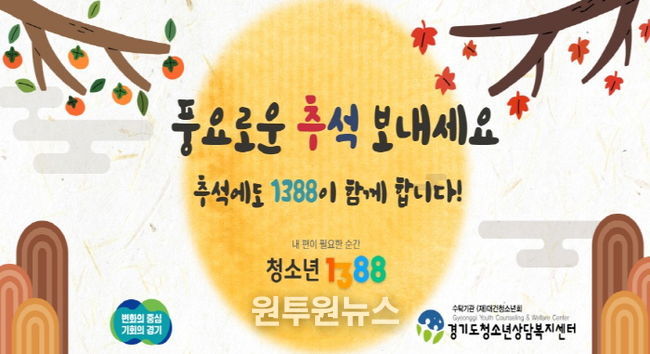 (원투원뉴스) 경기도는 개천절과 추석, 한글날이 이어지는 10월 3일부터 9일까지 연휴 기간에도 ‘청소년전화 1388’을 24시간 운영해 위기 청소년 상담과 발견·구조 서비스를 지원한다고 1일 밝혔다.