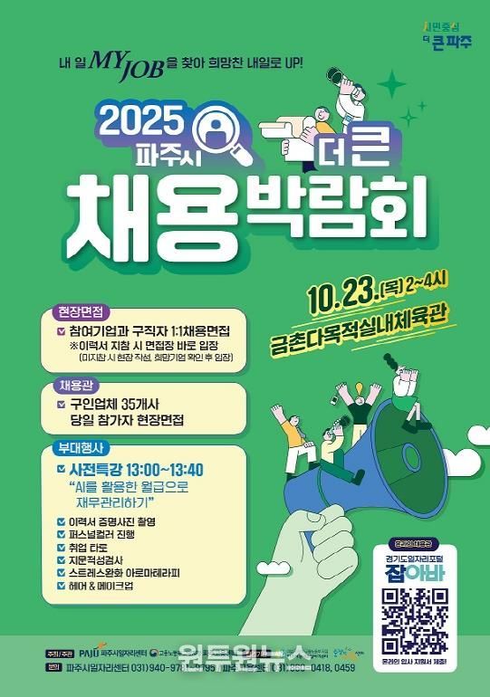 (원투원뉴스) 파주시는 오는 10월 23일 금촌다목적실내체육관 2층에서 ‘2025년 파주시 더 큰 채용박람회’를 개최한다고 밝혔다. 이에 앞서 행사에 참여할 구직자를 10월 1일부터 17일까지 모집한다.
