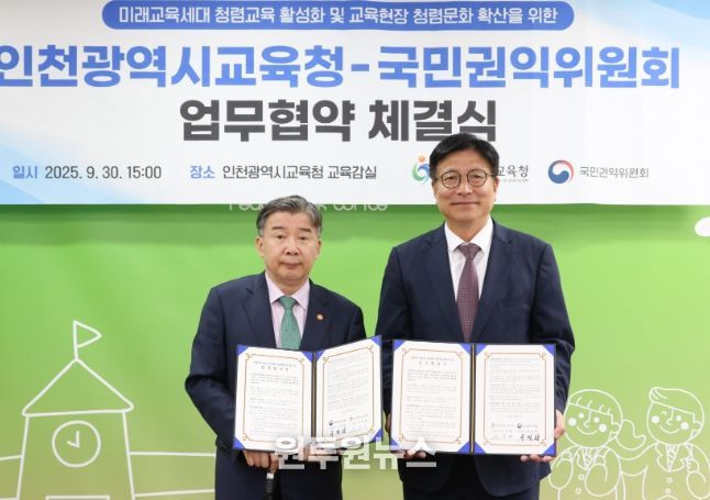 (원투원뉴스) 인천광역시교육청은 9월 30일 국민권익위원회와 청렴한 미래인재 양성과 교육 현장의 청렴 문화 확산을 위한 업무협약을 체결했다.