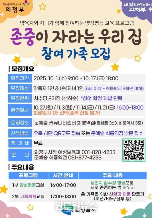 (원투원뉴스) 의정부시는 가정 내 존중과 배려의 문화를 확산하기 위해 문예숲 커뮤니티센터 회룡역점 프로그램 ‘존중이 자라는 우리 집’에 참여할 가족을 모집한다.