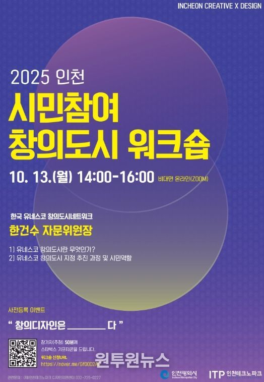 (원투원뉴스) 인천테크노파크(인천TP)와 인천시는 오는 13일 14시에 ‘시민참여 창의도시 워크숍’을 온라인으로 개최한다.