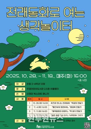 프로그램은 △1회차(10.28.) ‘퀴즈로 만나는 전래동화’와 책갈피 만들기 △2회차(11.4.) '빨간부채 파란부채'와 팝업북 만들기 △3회차(11.11.) '팥죽할멈과 호랑이'와 책 표지 만들기 △4회차(11.18.) '재주 많은 다섯 친구'와 네 컷 만화 그리기로 진행된다.