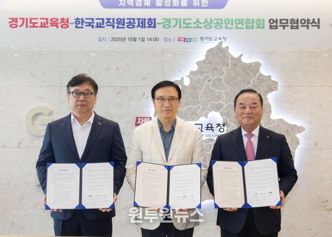 (원투원뉴스) 경기도교육청이 1일 남부청사에서 경기도소상공인연합회, 한국교직원공제회와 ‘지역경제 활성화를 위한 상생 업무협약’을 체결했다.