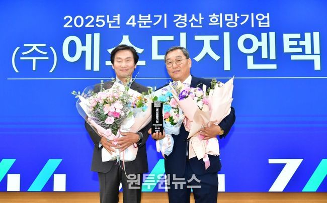 (원투원뉴스) 경산시(시장 조현일)는 (주)에스디지엔텍을 2025년 4분기 경산 희망 기업으로 선정하고 1일 정례회에서 트로피 시상 및 현판 전달식을 가졌다.