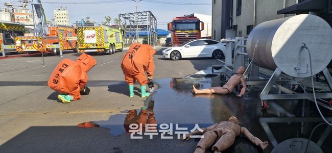 (원투원뉴스) 전북특별자치도소방본부는 지난 1일 119특수대응단 화학구조대 청사에서 유해화학물질 누출 사고 대응 역량 강화를 위한 합동훈련을 실시했다.