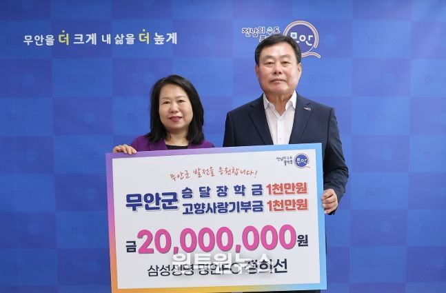 (원투원뉴스) 전남 무안군은 1일 삼성생명 정희선 명인FC가 지역 인재 양성과 지역 발전을 위해 소중히 써달라며 승달장학금 및 고향사랑기부금 각 1천만 원, 총 2천만 원을 기탁했다고 밝혔다.