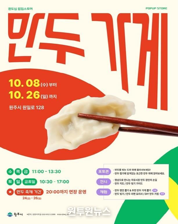 (원투원뉴스) 원주시는 원도심 활성화와 만두축제 홍보를 위해 오는 8일부터 26일까지 ‘만두가게’ 팝업스토어를 운영한다.