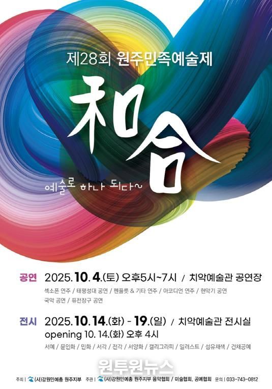 (원투원뉴스) (사)강원민예총 원주지부가 주최하는 ‘제28회 원주민족예술제’가 가을의 문을 열며 시민들에게 풍성한 문화적 감동을 선사한다. 치악예술관에서 열리는 이번 축제는 10월 4일 공연과 10월 14일부터 19일까지 진행되는 전시로 구성됐다.
