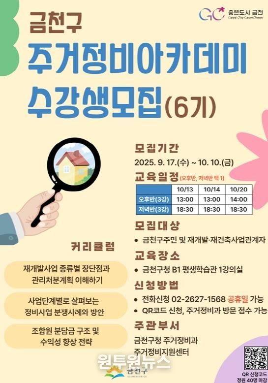 (원투원뉴스) 금천구는 노후 저층 주거지의 주거환경 개선과 재개발·재건축 정비사업의 원활한 추진을 위해 ‘2025년 금천구 주거정비아카데미 6기’를 운영한다고 밝혔다.