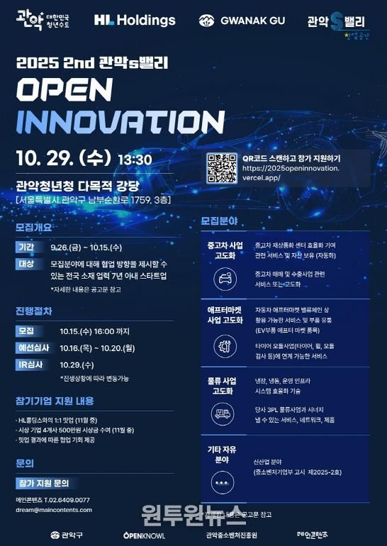 (원투원뉴스) 관악구가 자동차, 물류 분야 글로벌 네트워크를 보유한 ‘HL홀딩스’와 함께 ‘2025 제2회 관악S밸리 오픈 이노베이션’에 참가할 기업을 모집한다.