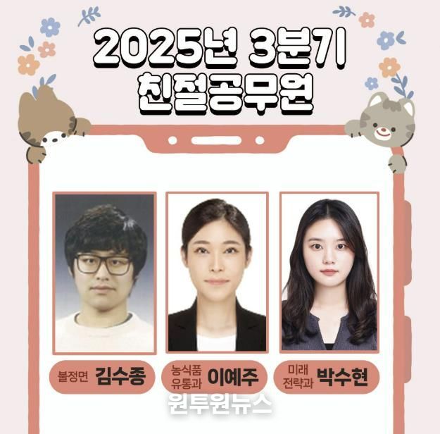 (원투원뉴스) 충북 괴산군은 2025년 3분기 친절공무원으로 김수종 주무관(불정면사무소), 이예주 주무관(농식품유통과), 박수현 주무관(미래전략과)을 선정했다고 밝혔다.