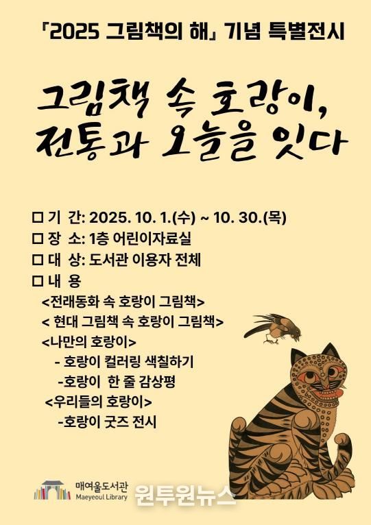 매여울도서관 관계자는 “호랑이는 옛이야기의 주인공이자 오늘날에도 살아 있는 한국의 상징”이라며 “시민들이 호랑이 그림책 속 이야기를 나누고, 세대를 잇는 그림책의 가치를 새롭게 발견하는 계기가 되길 바란다”고 말했다.