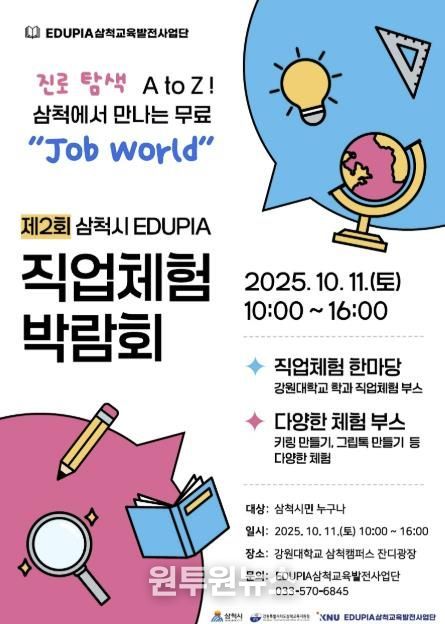 (원투원뉴스) 삼척시와 EDUPIA삼척교육발전사업단은 오는 10월 11일 오전 10시 강원대학교 삼척캠퍼스 잔디광장에서 ‘제2회 삼척시 EDUPIA 직업체험 박람회’를 개최한다고 밝혔다.