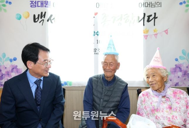 이날 100세 어르신께 드리는 청려장과 함께 과일·참치세트 등 위문품을 전달했으며, 케이크 커팅과 기념촬영을 통해 참석자 모두가 어르신들의 장수를 축하하는 시간을 가졌다.