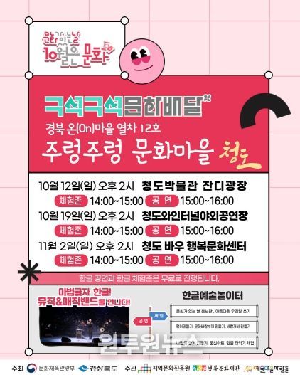 (원투원뉴스) 2025 문화가 있는 날 '구석구석 문화배달' 경북 온(On)마을 열차 12호 청도군 ‘주렁주렁 문화마을’가 10월 문화의 달을 맞아 총 3회의 공연을 선보인다. 이번 행사는 문화체육관광부와 경상북도가 주최하고, 지역문화진흥원·경북문화재단·예술마을사람들이 주관하며, 청도군과 협력해 진행된다.