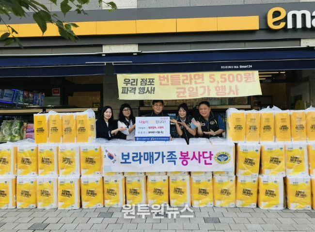공군전우회 봉사 모임인 보라매가족봉사단은 망포1동의 어려운 이웃을 위해 꾸준히 후원을 해오고 있으며, 지난 1월에는 컵라면 100박스, 지난 6월에는 고독사 위험군 1인가구를 위해 컵라면 150박스, 이번 추석 명절에는 롤화장지 100팩을 후원하여 지역사회에 훈훈한 미담이 되고 있다.