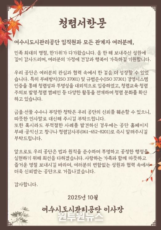 (원투원뉴스) 여수시도시관리공단은 민족 최대 명절인 추석을 앞두고 임직원과 관계자에게 청렴 서한문을 발송했다고 2일 밝혔다.