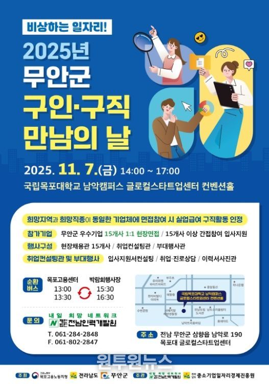 (원투원뉴스) 전남 무안군은 오는 11월 7일 목포대학교 남악캠퍼스 글로컬스타트업센터 컨벤션홀에서 개최하는 『2025년 무안군 구인·구직 만남의 날』행사에 참여할 기업을 모집한다.