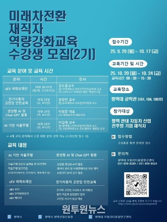 (원투원뉴스) 평택시와 평택산업진흥원이 ‘미래차 전환 재직자 역량 강화교육’ 2기 과정을 개설한다. 교육은 10월 20일부터 24일까지 교육 운영기관인 평택대학교에서 진행되며, 지역 자동차 산업 재직자를 대상으로 미래차 핵심 분야 전문지식을 제공한다.