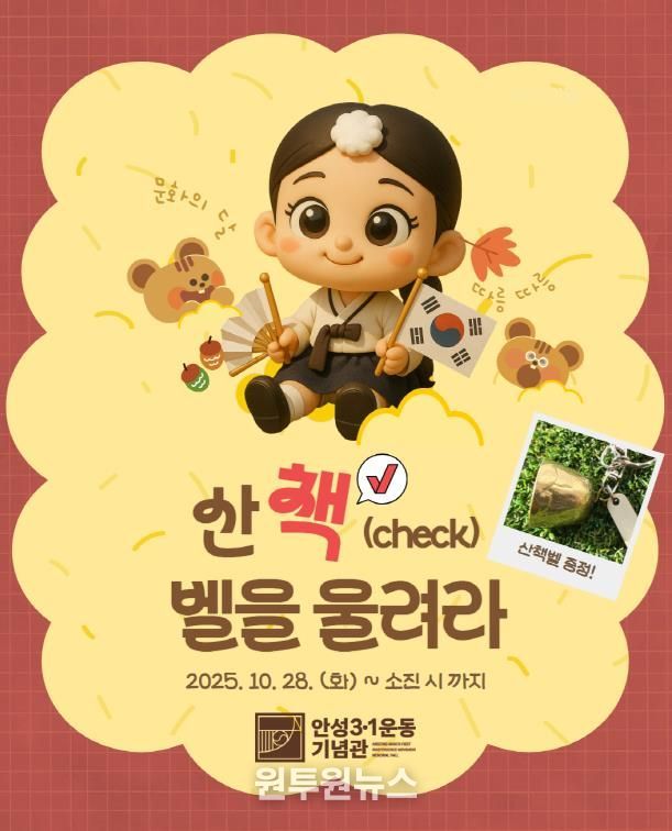 (원투원뉴스) 안성3.1운동기념관은 10월 문화의 달을 맞이하여 10월 28일(화)부터 특별 체험활동 “산책(Check) 벨을 울려라”를 진행한다.