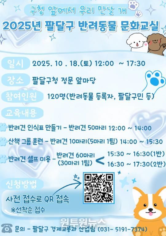 (원투원뉴스) 수원시 팔달구는 10월 18일 오후 12시부터 17시 30분까지 팔달구청 정문 앞마당에서 ‘2025년 팔달구 반려동물 문화교실’을 개최한다고 밝혔다.