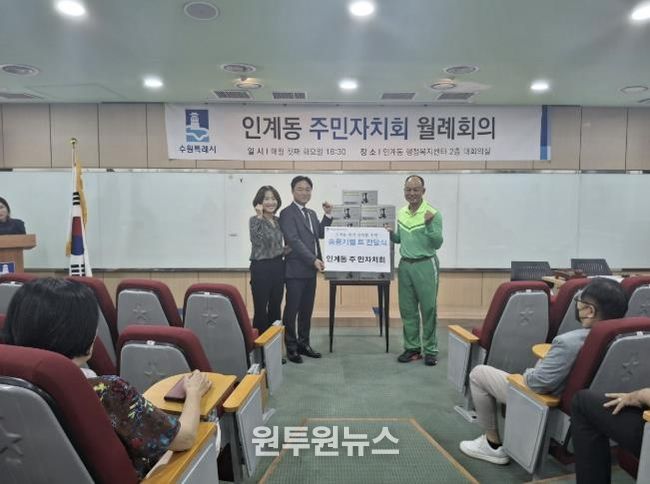 (원투원뉴스) 수원시 팔달구 인계동 주민자치회는 지난 10월 1일, 가을철 관내 낙엽청소용 송풍기 벨트(100만 원 상당)를 인계동 행정복지센터에 전달했다.