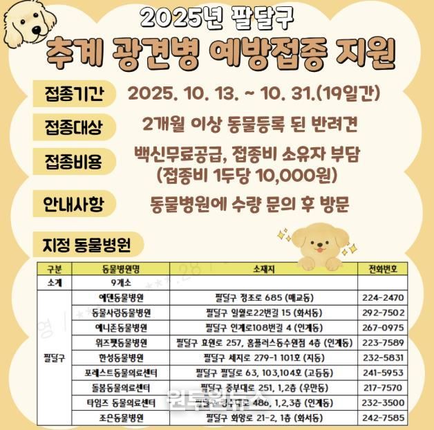 (원투원뉴스) 수원시 팔달구는 반려동물을 안전하게 보호하기 위해 10월 13일부터 10월 31일까지 광견병 백신을 무료 지원한다고 밝혔다.