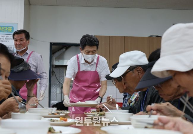 (원투원뉴스) 이강덕 포항시장이 2일 추석을 앞두고 무료급식소 ‘만나의집’을 방문해 어르신 200여 명에게 배식 봉사를 하며 감사의 마음을 전했다.