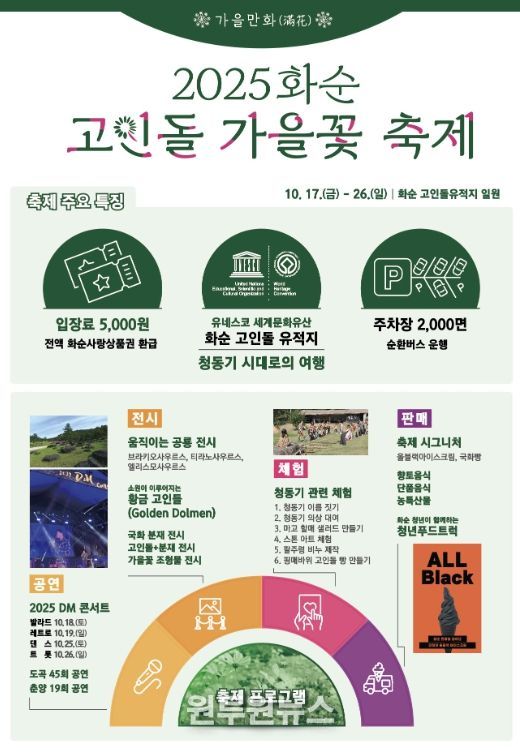 (원투원뉴스) 전남 화순군)이 오는 10월 17일 ~ 10월 26일까지 10일간 유네스코 세계문화유산인 화순 고인돌 유적지 일대(춘양면 대신리, 도곡면 효산리)에서 '가을만화(滿花)'를 주제로 '2025 화순 고인돌 가을꽃 축제'를 개최한다.