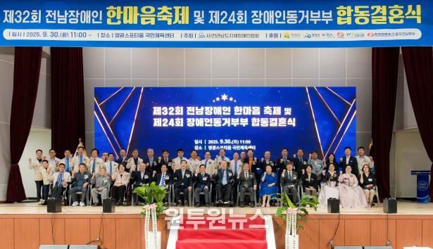 (원투원뉴스) 영광군은 지난 30일 영광스포티움 국민체육센터에서 22개 시·군 장애인단체 등 1,500여 명이 참석한 가운데‘제32회 전남장애인한마음대축제 및 제24회 장애인동거부부 합동결혼식’을 성황리에 개최했다고 밝혔다.