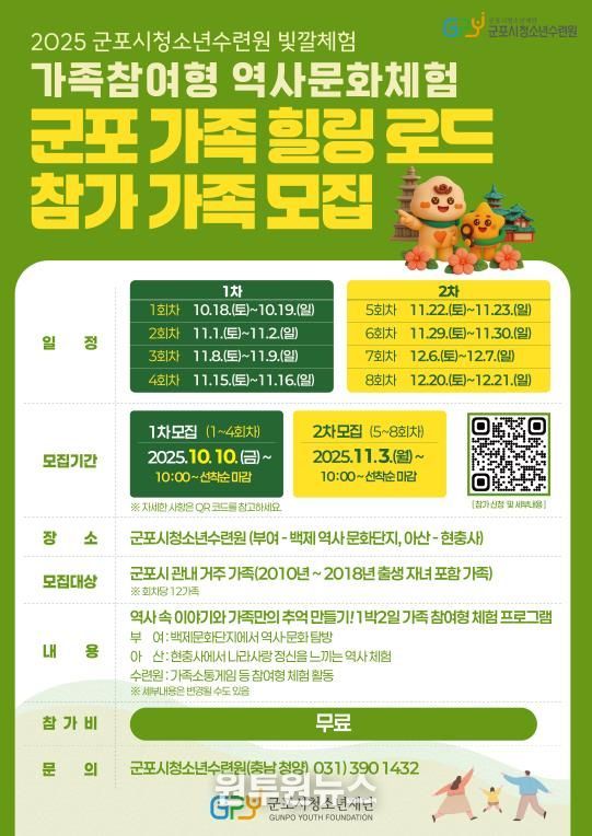 (원투원뉴스) 군포시청소년재단이 운영하는 군포시청소년수련원(충남 청양)은 관내 가족을 대상으로 2025년 가족참여형 역사문화탐방 '군포가족 힐링로드' 참가자를 모집한다.