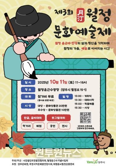 (원투원뉴스) (사)회천발전협의회와 월정윤근수기념사업회가 공동 주최하는 ‘제3회 양주 월정문화예술제’가 오는 10월 11일 오전 11시 월정 윤근수 광장(양주시 월정로 15-1)에서 열린다.
