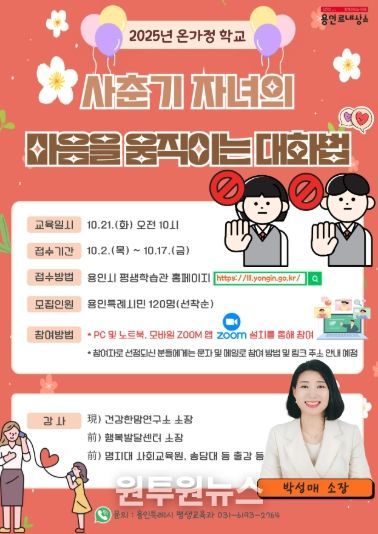 (원투원뉴스) 용인특례시는 ‘사춘기 자녀 마음을 움직이는 대화법’을 주제로 한 ‘2025년 온가정 학교’ 온라인 특강 참가자를 모집한다고 2일 밝혔다.
