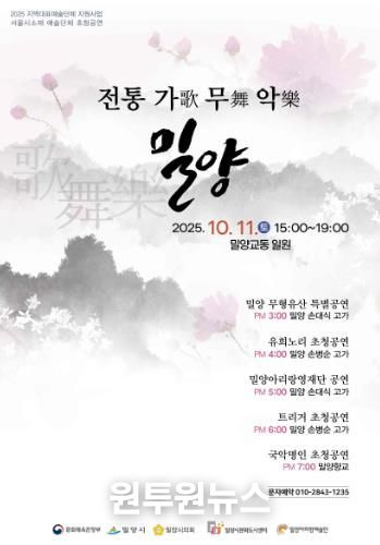 밀양시 관계자는 “전통예술의 감동을 함께 나누고, 우리 문화의 아름다움을 더욱 공유하는 시간이 될 것으로 기대한다”라며 “앞으로 밀양이 전통과 현대, 세대와 지역을 잇는 소통과 협업의 중심지가 되어, 문화예술의 지속 가능한 발전을 선도해 나가겠다”라고 말했다.