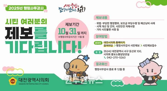 (원투원뉴스) 대전시의회는 2025년도 행정사무감사를 앞두고 내실있는 감사를 실시하기 위해 오는 10월 31일까지 다양한 시민 제보를 받는다.