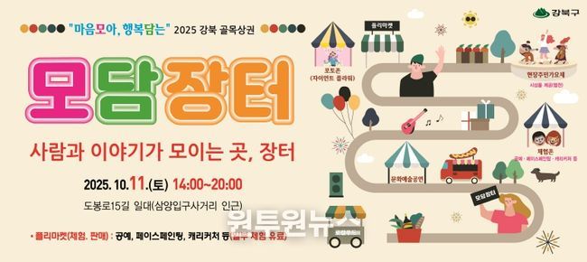 (원투원뉴스) 서울 강북구는 오는 11일 오후 2시부터 8시까지 삼양입구사거리 인근 도봉로15길 일대에서 ‘2025 강북 골목상권 모담장터’를 개최한다고 밝혔다.