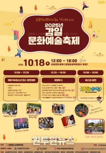 (원투원뉴스) 하남시 감일청소년문화의집은 오는 10월 18일 오후 12시부터 18시까지 감일문화공원(감일공공복합청사 뒷편)에서 '제2회 감일문화예술축제'를 개최한다.