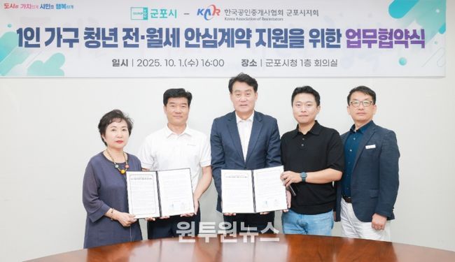 (원투원뉴스) 군포시는 10월 1일 시청 1층 회의실에서 한국공인중개사협회 군포시지회와 청년 1인 가구 전월세 안심계약 지원을 위한 업무협약을 체결했다.