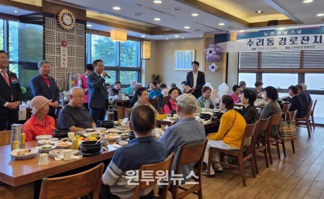 (원투원뉴스) 군포시 수리동 주민자치회(회장 고진해)는 제29회 노인의 날을 맞아 지난 10월 2일 수리동 어르신들을 대상으로 경로잔치를 개최했다. 이번 행사는 하은호 군포시장, 이학영 국회부의장 등 여러 내빈과 수리동 직능단체장들이 어르신 100여 명과 뜻깊은 자리를 함께했다.