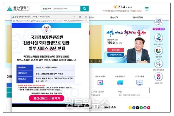 (원투원뉴스) 울산시는 국가정보자원관리원 대전센터 화재(9.26)로 인해 국민신문고 서비스가 전면 중단됨에 따라, 시민 불편을 최소화하기 위해 울산시 대표 홈페이지 내 온라인 민원창구 ‘울산신문고’를 10월 5일부터 운영한다.